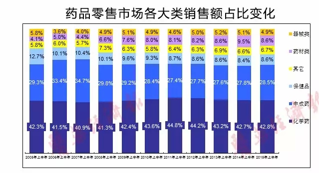 根據CFDA南方所廣州標點醫(yī)藥信息有限公司中國藥品零售系統(tǒng)監(jiān)測數據顯示,2015年上半年藥品零售市場化學藥、中成藥和保健品的銷售額占比分別為42.8%、28.5%和8.6%,化學藥銷售額占比與2014年同期相比上升0.1個百分點,中成藥上升0.7個百分點,保健品上升0.2個百分點,藥材類下降0.9個百分點,器械類下降0.2個百分點。從藥品零售市場各大類銷售額占比變化圖上看到,藥材類銷售額占比下滑較為明顯,中成藥類產品有所提升。