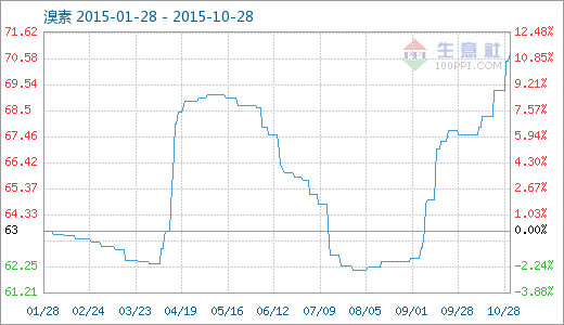 10月28日溴素商品指數(shù)為70.76,較昨日上升了0.29點,較周期內(nèi)最高點100.35點(2011-09-15)下降了29.49%,較2014年10月29日最低點58.92點上漲了20.10%。(注:周期指2011-09-01至今)