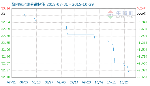 10月28日聚四氟乙烯分散樹脂商品指數(shù)為32.26,與昨日持平,創(chuàng)下周期內(nèi)的歷史新低,較2011年12月12日最高點103.09點下降了68.71%。(注:周期指2011-09-01至今)