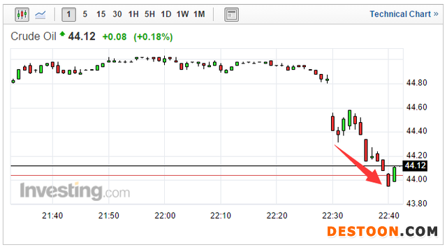 整體看,上周(4.18-22)EIA庫存高于預(yù)期。數(shù)據(jù)公布后,油價(jià)漲幅大幅收窄。WTI 6月原油期貨完全回吐日內(nèi)稍早超過2%的漲幅,并失守44美元/桶關(guān)口,一度交投于43.95美元/桶。下圖為美油走勢(shì):