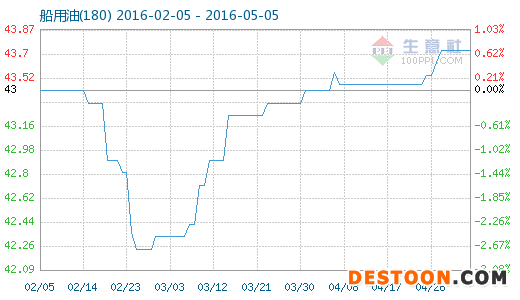5月5日船用油(180)商品指數(shù)為43.73,與昨日持平,較周期內(nèi)最高點104.84點(2013-03-12)下降了58.29%,較2016年02月28日最低點42.24點上漲了3.53%。(注:周期指2012-09-01至今)