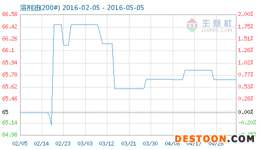 5月5日溶劑油(200#)商品指數(shù)為65.59,較昨日下降了0.13點(diǎn),較周期內(nèi)最高點(diǎn)103.41點(diǎn)(2012-09-23)下降了36.57%,較2016年02月18日最低點(diǎn)65.12點(diǎn)上漲了0.72%。(注:周期指2012-09-01至今)