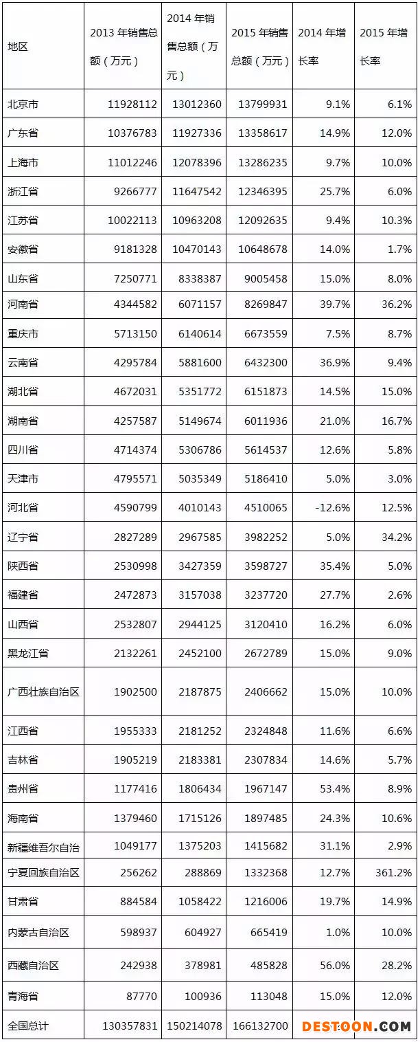 表3 2013年至2015年各省中成藥類(lèi)銷(xiāo)售總額