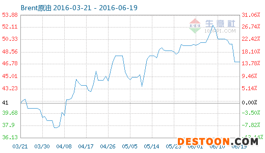 6月19日Brent原油商品指數(shù)為47.10,與昨日持平,較周期內(nèi)最高點100.00點(2014-09-09)下降了52.90%,較2016年01月21日最低點27.82點上漲了69.30%。(注:周期指2014-09-09至今)