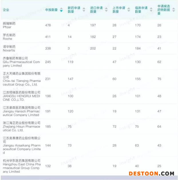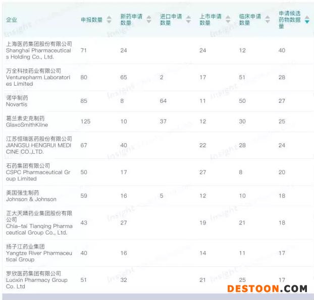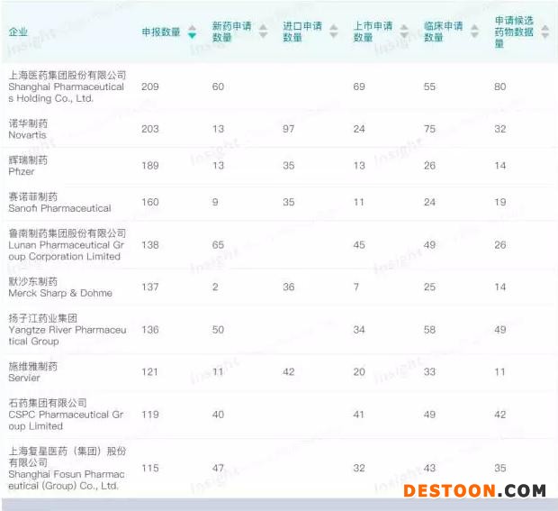 從受理號(hào)申報(bào)數(shù)量來看,上海醫(yī)藥奪得 TOP 1。諾華、輝瑞、賽諾菲三巨頭緊跟其后。魯南、揚(yáng)子江、石藥和復(fù)星,也進(jìn)入了 TOP 10。