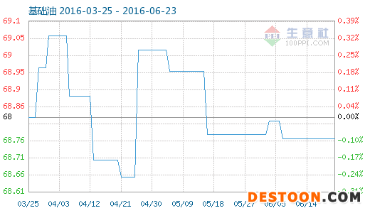 6月23日基礎(chǔ)油商品指數(shù)為68.77,與昨日持平,較周期內(nèi)最高點(diǎn)104.60點(diǎn)(2014-04-16)下降了34.25%,較2016年04月25日最低點(diǎn)68.66點(diǎn)上漲了0.16%。(注:周期指2013-12-01至今)