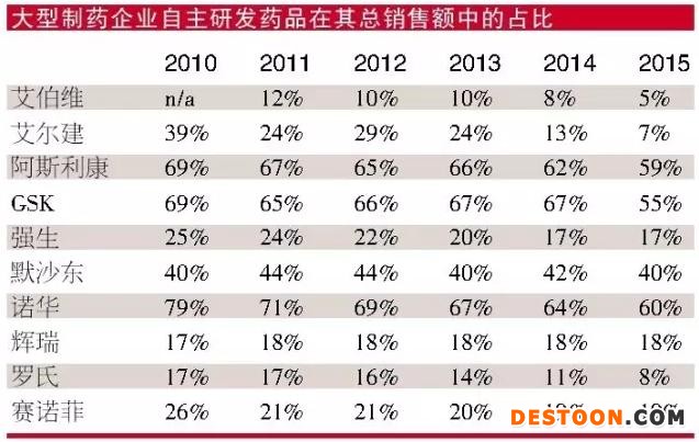 evaluatePharma 2015年的數(shù)據(jù)分析表明,全球十大制藥企業(yè)中,有6家公司從自主研發(fā)藥品中獲得的銷售額還不及其總銷售額的20%。