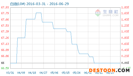 6月29日白油(10#)商品指數(shù)為66.71,與昨日持平,較周期內(nèi)最高點100.00點(2013-12-01)下降了33.29%,較2016年03月30日最低點66.57點上漲了0.21%。(注:周期指2013-12-01至今)