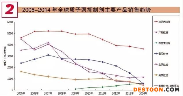 泮托拉唑是德國(guó)百克頓公司于1994年上市的質(zhì)子泵抑制劑,商品名為“潘妥洛克”,在美國(guó)由惠氏制藥以Protonix商品名上市銷售。2005年8月專利期滿,美國(guó)專利保護(hù)延長(zhǎng)至2010年。2000-2007年,泮托拉唑市場(chǎng)上升較快,但2008-2014年呈下降態(tài)勢(shì)。2007年銷售額達(dá)到42.2億美元,2014年則快速下跌至11.8億美元。