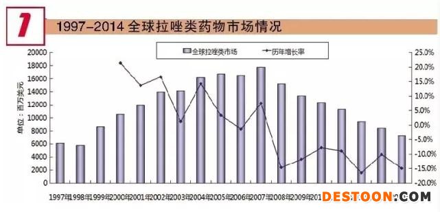 蘭索拉唑是由日本武田公司開(kāi)發(fā)的第二代質(zhì)子泵抑制劑。該藥1997-2005年市場(chǎng)上升較快,但2006-2014年則快速下降。2003年,其銷售額超過(guò)奧美拉唑,達(dá)到46.6億美元,在全球拉唑類藥物中排名第一位,2007開(kāi)始市場(chǎng)快速下降。