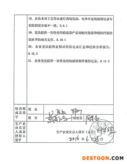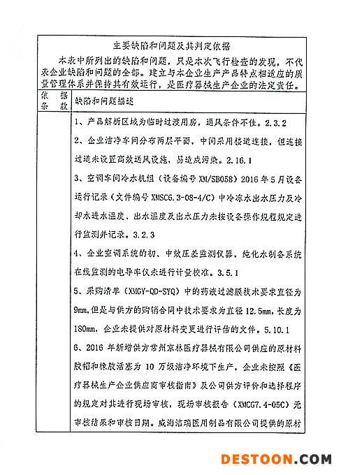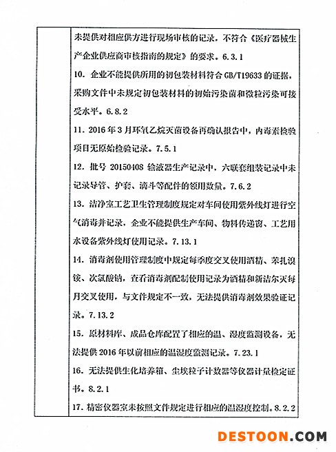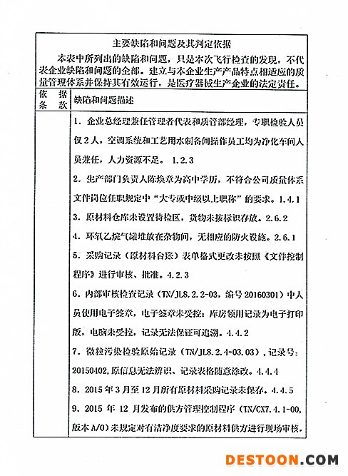 洪湖泰寧醫(yī)療器械有限公司的以下行為(見(jiàn)下表)不符合醫(yī)療器械生產(chǎn)質(zhì)量管理規(guī)范相關(guān)要求,質(zhì)量管理體系存在缺陷。該企業(yè)于2016年6月25日申報(bào)停產(chǎn)。該企業(yè)恢復(fù)生產(chǎn)前應(yīng)當(dāng)按照有關(guān)規(guī)定書面報(bào)告湖北省食品藥品監(jiān)督管理局,經(jīng)湖北省食品藥品監(jiān)督管理局核查符合要求后方可恢復(fù)生產(chǎn)。