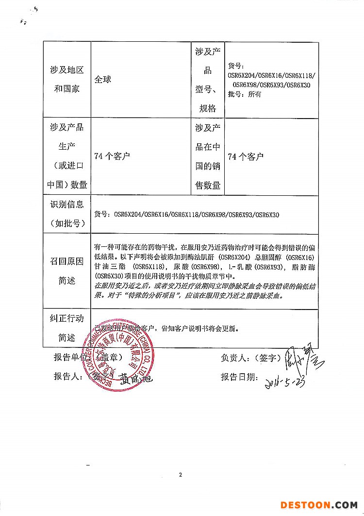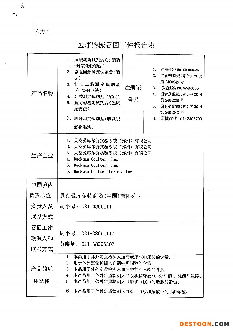 13、貝克曼庫爾特商貿(mào)(中國)有限公司對尿酸測定試劑盒、總膽固醇測定試劑盒、甘油三酯測定試劑盒、乳酸測定試劑盒、脂肪酶測定試劑盒、肌酐測定試劑盒主動召回