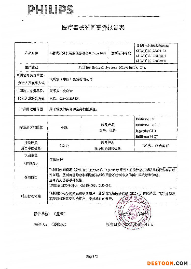 10、飛利浦(中國)投資有限公司對X射線計算機斷層攝影設(shè)備主動召回