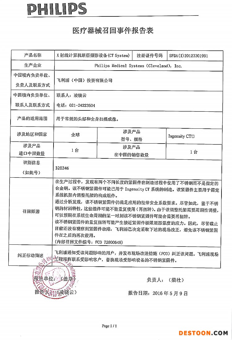 飛利浦(中國)投資有限公司報告:公司發(fā)現(xiàn)有兩個不同長度的緊固件在制造過程中使用了不繡鋼而不是指定的合金鋼,這可能導致故障發(fā)生。公司決定召回相關(guān)產(chǎn)品,本次召回級別III級,涉及產(chǎn)品的型號、規(guī)格及批次等詳細信息見《醫(yī)療器械召回事件報告表》。
