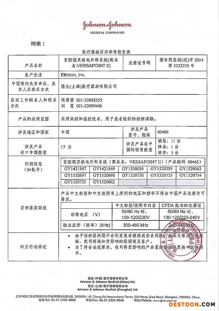 強生(上海)醫(yī)療器材有限公司報告:涉及產(chǎn)品的中文標簽和中文說明書上所列的電壓和頻率不符合中國產(chǎn)品注冊許可證要求。公司決定召回相關(guān)產(chǎn)品,本次召回級別III級,涉及產(chǎn)品的型號、規(guī)格及批次等詳細信息見《醫(yī)療器械召回事件報告表》。