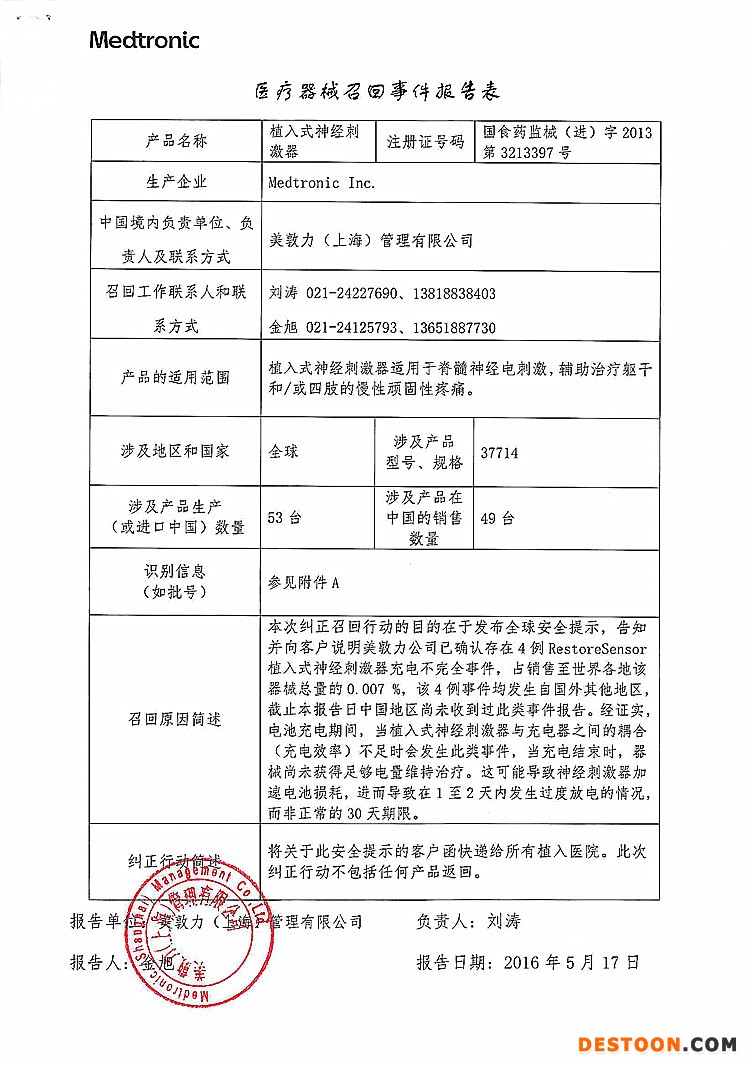 7、美敦力(上海)管理有限公司對植入式神經(jīng)刺激器主動召回