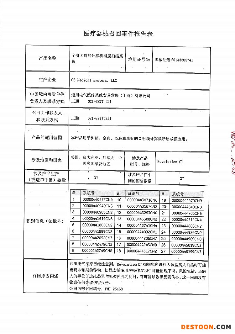 通用電氣醫(yī)療系統(tǒng)貿(mào)易發(fā)展(上海)有限公司報告:企業(yè)發(fā)現(xiàn),Revolution CT掃描床在進行大體型病人掃描時可能出現(xiàn)非預期的移動,掃描床板在用戶操作過程中可能出現(xiàn)下降,有可能導致傷害。公司決定召回相關(guān)產(chǎn)品,本次召回級別II級,涉及產(chǎn)品的型號、規(guī)格及批次等詳細信息見《醫(yī)療器械召回事件報告表》。