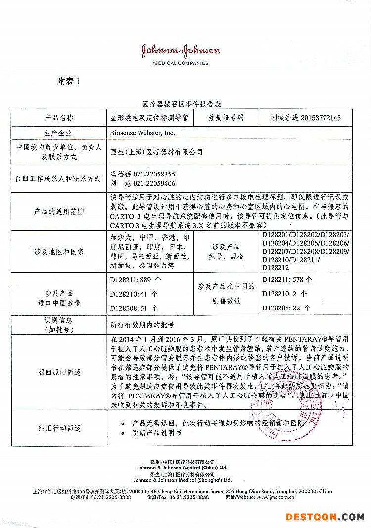 4、強生(上海)醫(yī)療器材有限公司對星形磁電雙定位標測導管主動召回