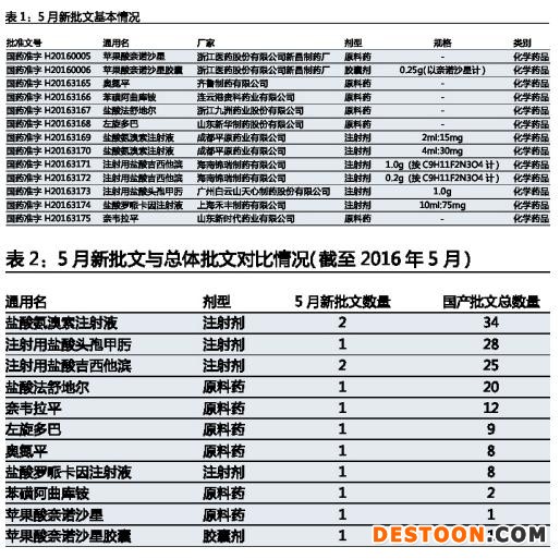 根據(jù)CFDA公布的信息,2016年5月批出13個新國產(chǎn)批文和1個新進口批文。所有新批文全是化學(xué)藥品。按注冊分類統(tǒng)計,13個國產(chǎn)批文中有2個批文是1.1類,其它批文全部都是6類。按劑型統(tǒng)計分析,只有1個口服劑型獲批,注射劑和原料藥各有6個批文。