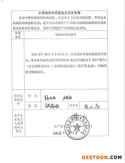 重慶埃夫朗生物技術(shù)有限責(zé)任公司于2016年3月25日向重慶市食品藥品監(jiān)督管理局、重慶市江北區(qū)分局提交了《停產(chǎn)報(bào)告》。經(jīng)檢查組現(xiàn)場(chǎng)核實(shí),該企業(yè)處于停產(chǎn)狀態(tài)。該企業(yè)恢復(fù)生產(chǎn)前應(yīng)當(dāng)按照有關(guān)規(guī)定書(shū)面報(bào)告重慶市食品藥品監(jiān)督管理局,經(jīng)重慶市食品藥品監(jiān)督管理局核查符合要求后方可恢復(fù)生產(chǎn)。