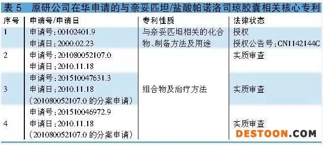 福沙匹坦二甲葡胺相關(guān)的化合物專利95192860.0已于2015年2月失效,而一項(xiàng)與福沙匹坦二甲葡胺制備方法相關(guān)的專利申請(qǐng)200580038036.8已被駁回,另一項(xiàng)專利申請(qǐng)201310096453.4目前處于實(shí)質(zhì)審查階段(詳見表4)。