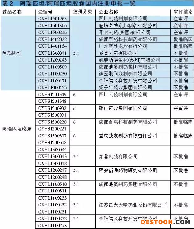 阿瑞匹坦尚未實(shí)現(xiàn)國產(chǎn)化。CFDA已于2013年7月22日批準(zhǔn)原研公司的阿瑞匹坦膠囊(商品名:意美)進(jìn)口中國,國內(nèi)該品種市場正處于培育期。迄今,我國已有包括四川制藥制劑和輔仁藥業(yè)等在內(nèi)的多家企業(yè)向CFDA提出有關(guān)阿瑞匹坦膠囊的注冊(cè)申請(qǐng)。然而,至今僅成都百裕和重慶藥友獲得臨床批文,包括揚(yáng)子江藥業(yè)、江蘇正大天晴和成都地奧等在內(nèi)的6家企業(yè)的審評(píng)結(jié)論均為“不批準(zhǔn)”(詳見表2)。可見,盡管本品國內(nèi)企業(yè)關(guān)注度頗高,但順利獲得臨床批文的企業(yè)并不多。