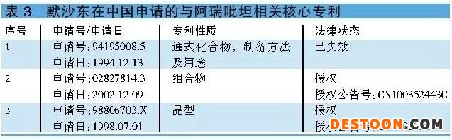 默沙東在華申請(qǐng)了多項(xiàng)與阿瑞吡坦相關(guān)的核心專利(詳見表3)。其中,化合物專利94195008.5已于2014年12月失效,晶型專利98806703.X和組合物專利02827814.3將分別于2018年7月和2022年12月到期。