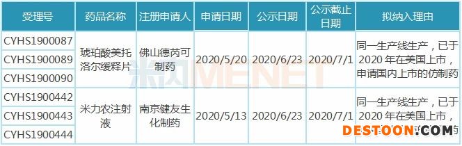 中國醫(yī)藥化工網(wǎng)6月30日訊 日前,CDE更新一批擬優(yōu)先審評目錄品種,南京健友生化制藥的米力農(nóng)注射液、佛山德芮可制藥的琥珀酸美托洛爾緩釋片在列,兩個產(chǎn)品以仿制4類報產(chǎn),擬納入理由均為“同一生產(chǎn)線生產(chǎn),已于2020年在美國上市,申請國內(nèi)上市的仿制藥”。米內(nèi)網(wǎng)數(shù)據(jù)顯示,2019年中國公立醫(yī)療機構(gòu)終端米力農(nóng)注射液、琥珀酸美托洛爾緩釋片銷售額分別為10.5億元、23.37億元,前者暫未有企業(yè)過評,后者未有首仿獲批。