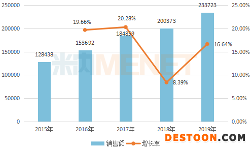 米內(nèi)網(wǎng)數(shù)據(jù)顯示,2019年中國城市公立醫(yī)院、縣級公立醫(yī)院、城市社區(qū)中心以及鄉(xiāng)鎮(zhèn)衛(wèi)生院(簡稱中國公立醫(yī)療機構(gòu))終端鹽酸溴己新銷售額為23.04億元,同比下滑1.22%,其中注射劑銷售占比超九成。