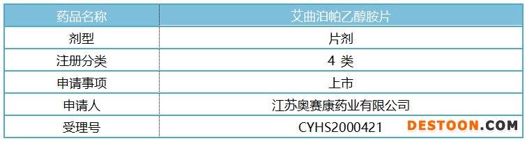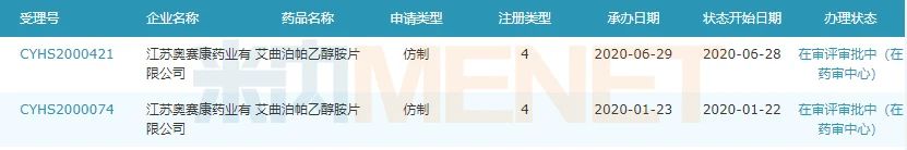 公告中提到,江蘇奧賽康藥業(yè)是該產(chǎn)品國內(nèi)第一家完成了臨床生物等效性研究遞交生產(chǎn)注冊申請的企業(yè),米內(nèi)網(wǎng)數(shù)據(jù)顯示,奧賽康分別在2020年1月及6月申報過艾曲泊帕乙醇胺片的4類仿制上市申請,目前兩個受理號均在審評審批中。
