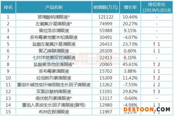 2019年中國(guó)公立醫(yī)療機(jī)構(gòu)終端滴眼液TOP15產(chǎn)品銷售額均超1億元,合計(jì)銷售額47.31億元,其中玻璃酸鈉滴眼液突破10億元;同比2018年,TOP15產(chǎn)品名單不變,排名進(jìn)行更替,雙氯芬酸鈉滴眼液上升3個(gè)名次,鹽酸奧洛他定滴眼液、拉坦前列素滴眼液均上升2個(gè)位次。