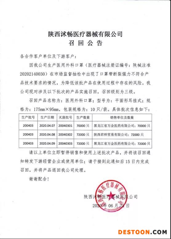 公告指出,由于該公司生產(chǎn)的醫(yī)用外科口罩(生產(chǎn)批號(hào)200403)口罩帶斷裂強(qiáng)力不符合注冊(cè)技術(shù)要求,陜西沭暢醫(yī)療器械有限公司對(duì)其生產(chǎn)的醫(yī)用外科口罩(生產(chǎn)批號(hào)200403)主動(dòng)召回,召回級(jí)別為三級(jí)。