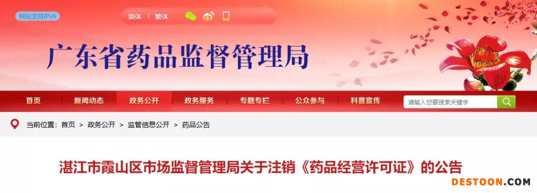 7月6日,廣東省藥監(jiān)局官網(wǎng)轉(zhuǎn)發(fā)了湛江市霞山區(qū)市場局關(guān)于注銷《藥品經(jīng)營許可證》的公告。