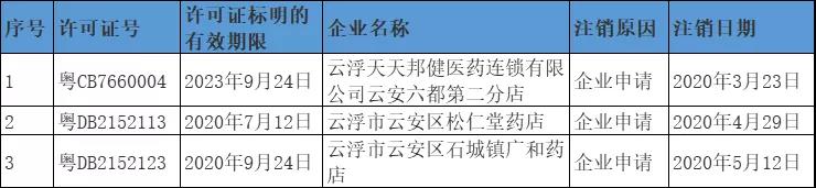7月3日,廣東省藥監(jiān)局轉(zhuǎn)發(fā)了云浮市云安區(qū)市場監(jiān)督管理局關(guān)于注銷《藥品經(jīng)營許可證》的通告2020年(01號)。