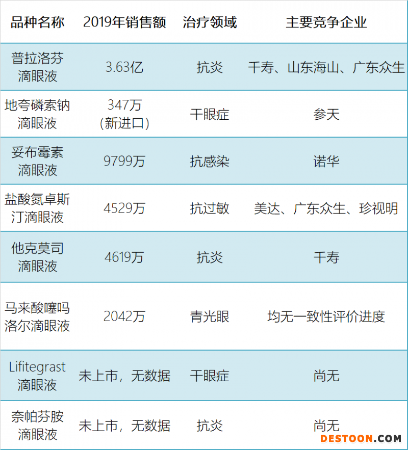 重點開發(fā)冷門產(chǎn)品,可避開激烈的競爭,有望實現(xiàn)首家仿制上市或首家通過一致性評價,搶占市場先機(jī)。競爭壓力較小的滴眼液的銷售額和競爭情況如下: