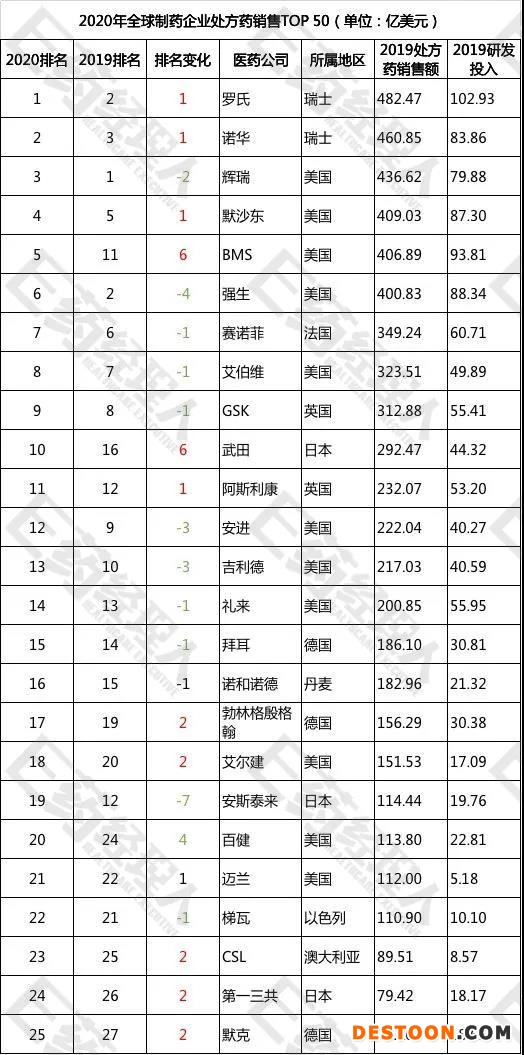 6月12日,美國(guó)《制藥經(jīng)理人(Pharm Exec)》雜志公布了2020年全球制藥企業(yè)50強(qiáng)排行榜。