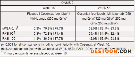 2020年07月18日訊 /生物谷BIOON/ --禮來(Eli Lilly)近日公布了新型抗炎藥mirikizumab治療中重度斑塊型銀屑病III期OASIS-2研究的陽性結(jié)果。結(jié)果顯示,與安慰劑相比,mirikizumab在第16周(優(yōu)越性)達(dá)到了主要終點和全部關(guān)鍵次要終點。此外,與諾華抗炎藥Cosentyx(中文商品名:可善挺,通用名:secukinumab,司庫奇尤單抗,俗稱“蘇金單抗”)相比,mirikizumab在第16周(非劣效性)和第52周(優(yōu)越性)達(dá)到了全部關(guān)鍵次要終點,包括第52周皮損完全清除方面的優(yōu)越性。
