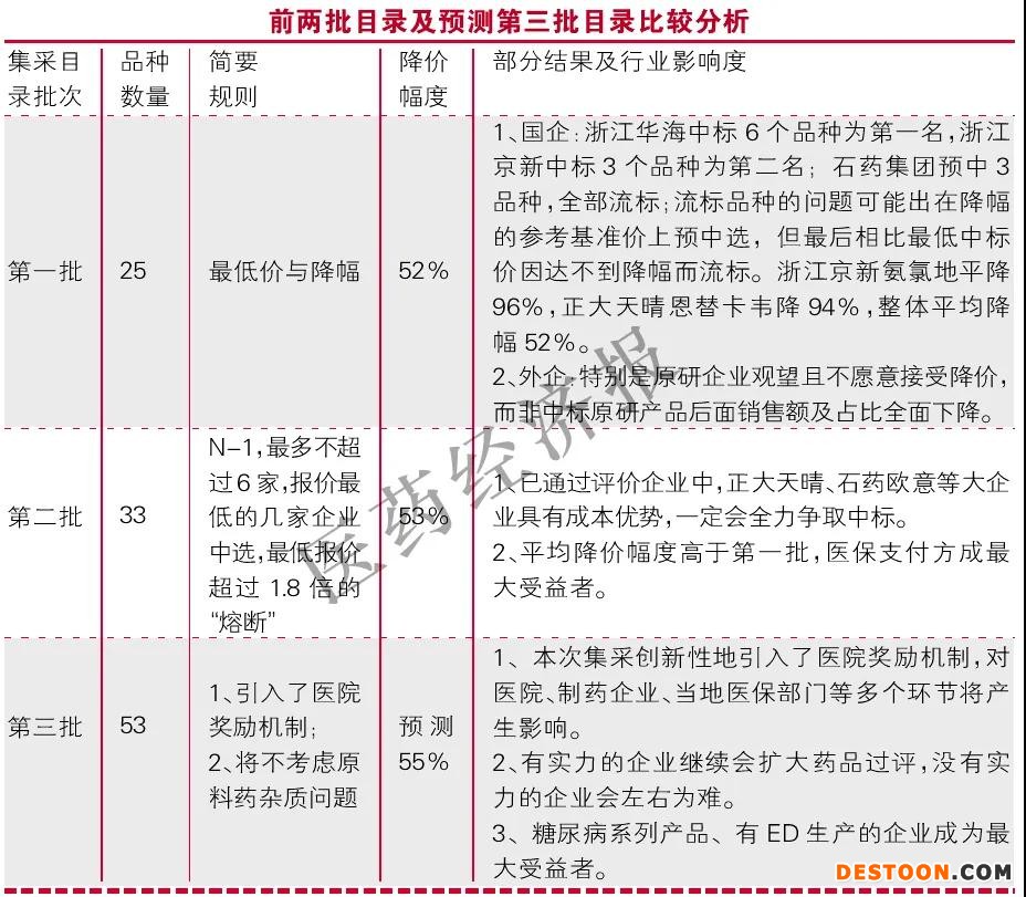 醫(yī)院市場已經(jīng)成為國家買單的主流市場,其各項政策已經(jīng)是大企業(yè)展示的平臺,成長型企業(yè)或小藥企,因為成本、品牌、營銷等各個方面的制約,都難以與大企業(yè)所抗衡,所以醫(yī)院市場轉(zhuǎn)戰(zhàn)至零售或基層醫(yī)療市場將是未來這些產(chǎn)品延長生命周期的關(guān)鍵。而開拓新型領(lǐng)域同樣需要周期性的全方位投入,不轉(zhuǎn)型難以生存,轉(zhuǎn)型是否能夠成功,尚不能下結(jié)論。據(jù)北京旭日博遠(yuǎn)管理咨詢分析人士梳理,前兩批目錄及預(yù)測第三批目錄比較及行業(yè)影響度如表所示。