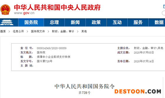 7月18日,國(guó)務(wù)院官網(wǎng)消息顯示,為切實(shí)保護(hù)中小企業(yè)合法權(quán)益、進(jìn)一步優(yōu)化營(yíng)商環(huán)境,國(guó)務(wù)院日前公布《保障中小企業(yè)款項(xiàng)支付條例》(下稱《條例》),自2020年9月1日起施行。