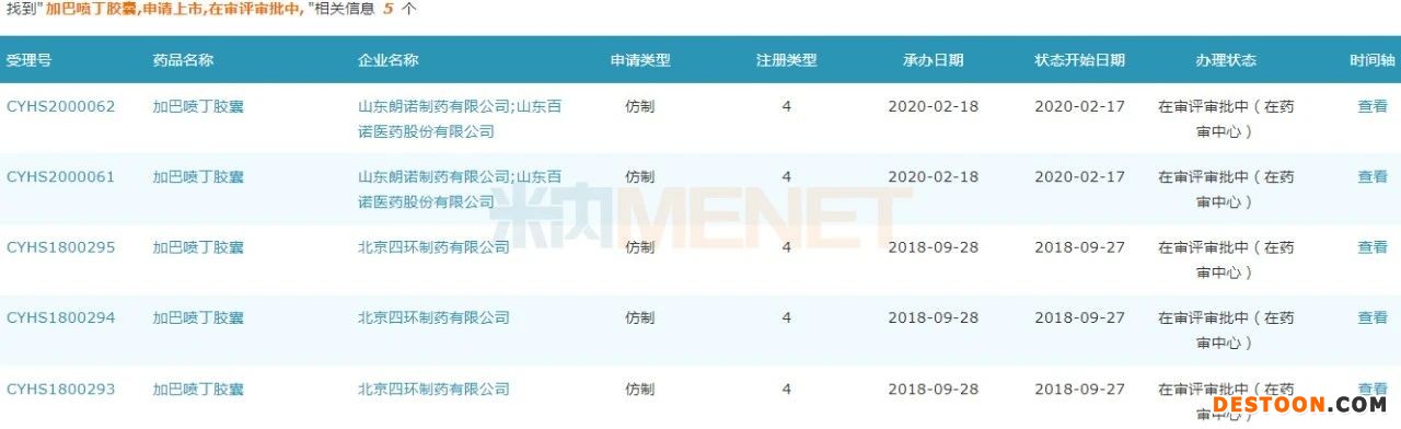 7月24日,CDE官網(wǎng)顯示,浙江永太藥業(yè)的加巴噴丁膠囊4類仿制上市申請獲得受理。米內(nèi)網(wǎng)數(shù)據(jù)顯示,2019年中國公立醫(yī)療機(jī)構(gòu)終端加巴噴丁膠囊劑銷售額達(dá)1.82億元,生產(chǎn)企業(yè)僅有恩華藥業(yè)和恒瑞醫(yī)藥兩家。