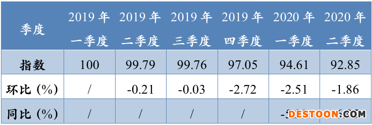 2019年南京市建立醫(yī)用耗材陽光監(jiān)管平臺,對醫(yī)用耗材價格進(jìn)行實(shí)時監(jiān)測,根據(jù)監(jiān)測結(jié)果顯示,2019年一季度至2020年二季度價格指數(shù)呈下降態(tài)勢,其中,自2019年四季度開始,指數(shù)出現(xiàn)明顯下降,環(huán)比降幅分別為2.72%、2.51%和1.86%;2020年一季度開始,同比降幅分別為5.39%和6.95%,降幅呈擴(kuò)大態(tài)勢。