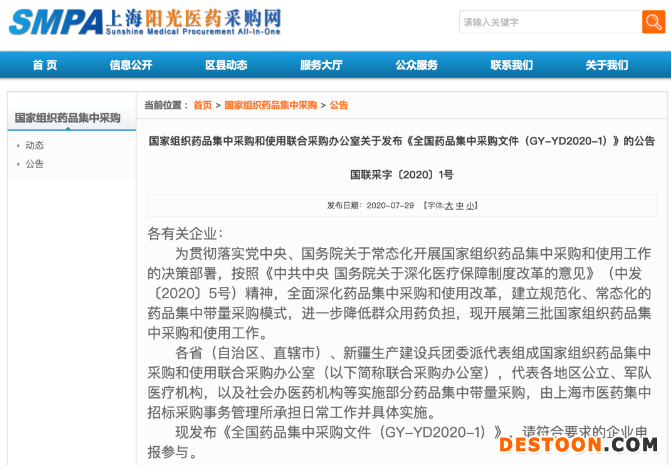 醫(yī)藥網(wǎng)7月30日訊 7月29日,上海陽光醫(yī)藥采購網(wǎng)發(fā)布“國家組織藥品集中采購和使用聯(lián)合采購辦公室關(guān)于發(fā)布《全國藥品集中采購文件(GY-YD2020-1)》的公告(國聯(lián)采字〔2020〕1號)”,同時掛網(wǎng)公布《采購品種目錄》《各地首年約定采購量》和《各采購品種首年約定采購量》。