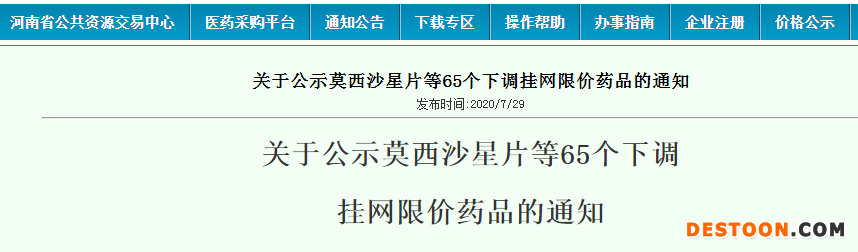 通知顯示,根據(jù)《關于開展河南省2019年度藥品價格聯(lián)動工作的通知》,將莫西沙星片等65個下調掛網(wǎng)限價藥品予以公示,公示期自2020年7月29日至7月31日。公示期結束后,下調后采購限價將更新至河南省醫(yī)藥采購平臺。