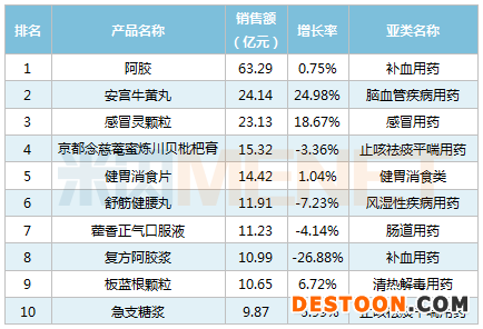 2019年中國(guó)城市零售藥店終端中成藥產(chǎn)品TOP10中,9個(gè)產(chǎn)品的銷售額超過(guò)10億元,阿膠以63.29億元的銷售額遙遙領(lǐng)先;安宮牛黃丸以24.98%的銷售增長(zhǎng)率領(lǐng)跑,復(fù)方阿膠漿的銷售額大跌26.88%。