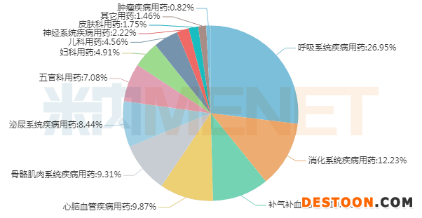 中成藥涵蓋13個(gè)治療大類,零售市場(chǎng)中呼吸系統(tǒng)疾病用藥獨(dú)占鰲頭,占據(jù)26.95%的市場(chǎng)份額,消化系統(tǒng)疾病用藥、補(bǔ)氣補(bǔ)血類用藥則位列第二、第三。