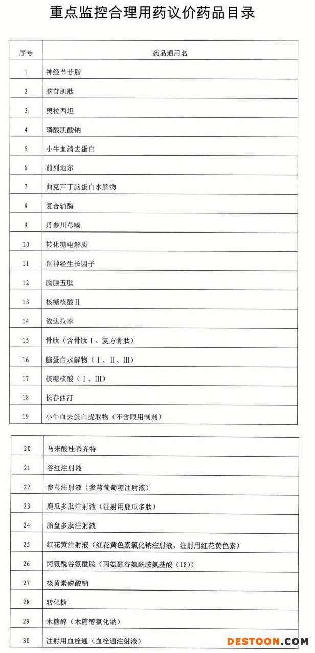 30個(gè)品種包括了20個(gè)第一批國(guó)家重點(diǎn)監(jiān)控合理用藥藥品目錄中的藥品,還有10個(gè)省級(jí)、武漢市醫(yī)療機(jī)構(gòu)重點(diǎn)監(jiān)控藥品,化藥、中藥均在列,包括參芎注射液、鹿瓜多肽注射液、胎盤多肽注射液、丙氨酰谷氨酰胺、注射用血栓通(血栓通注射液)等。