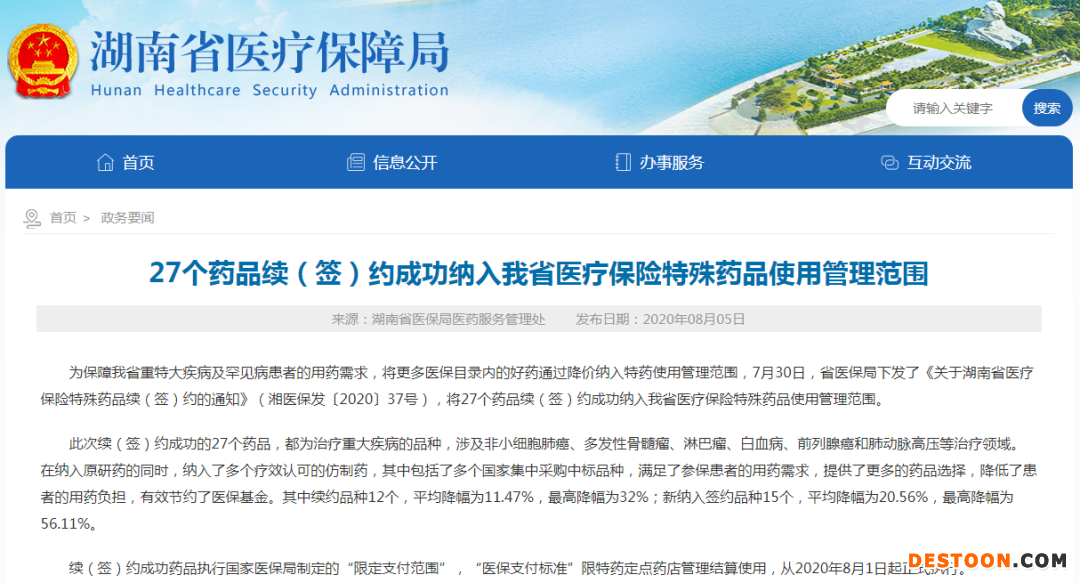 根據(jù)湖南省醫(yī)保局公布的消息,此次續(xù)(簽)約成功的27個(gè)藥品,涉及非小細(xì)胞肺癌、多發(fā)性骨髓瘤、淋巴瘤、白血病、前列腺癌和肺動(dòng)脈高壓等治療領(lǐng)域。其中續(xù)約品種12個(gè),平均降幅為11.47%,最高降幅為32%;新納入簽約品種15個(gè),平均降幅為20.56%,最高降幅為56.11%。