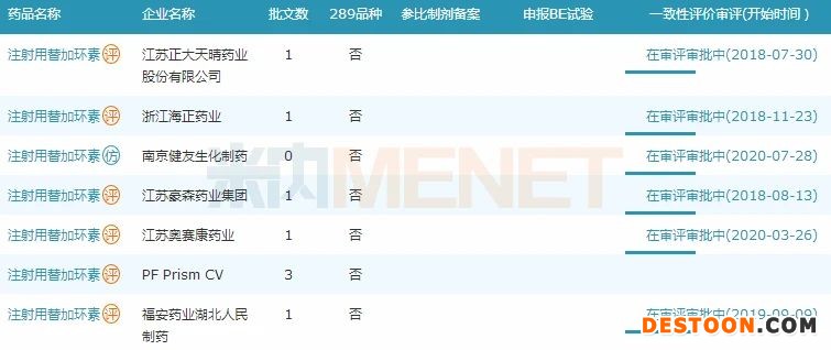注射用替加環(huán)素也暫未有企業(yè)過(guò)評(píng),6家企業(yè)已布局該產(chǎn)品一致性評(píng)價(jià),包括奧賽康、正大天晴、豪森等。南京健友生化以新分類報(bào)產(chǎn),其余5家企業(yè)均提交一致性評(píng)價(jià)補(bǔ)充申請(qǐng)。