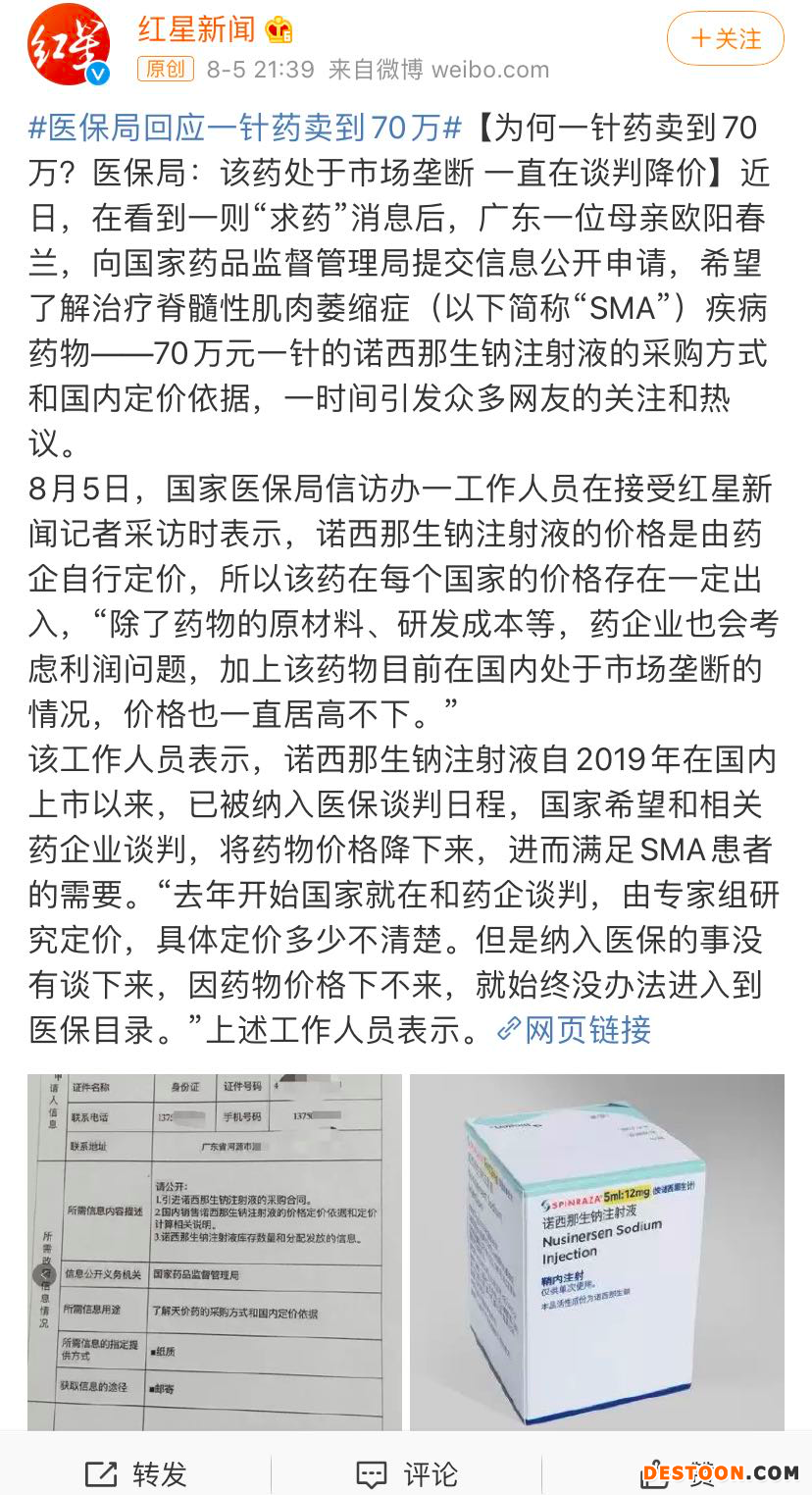 據(jù)紅星新聞報(bào)道,廣東一位母親,向國(guó)家藥監(jiān)局提交信息公開(kāi)申請(qǐng),希望了解70萬(wàn)元一針的諾西那生鈉注射液的采購(gòu)方式和國(guó)內(nèi)定價(jià)依據(jù),引發(fā)網(wǎng)友的關(guān)注和熱議。