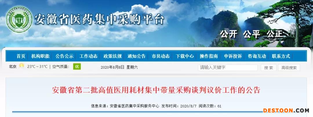 8月7日,安徽省醫(yī)藥集中采購平臺發(fā)布《安徽省第二批高值醫(yī)用耗材集中帶量采購談判議價工作的公告》(下稱《公告》)。
